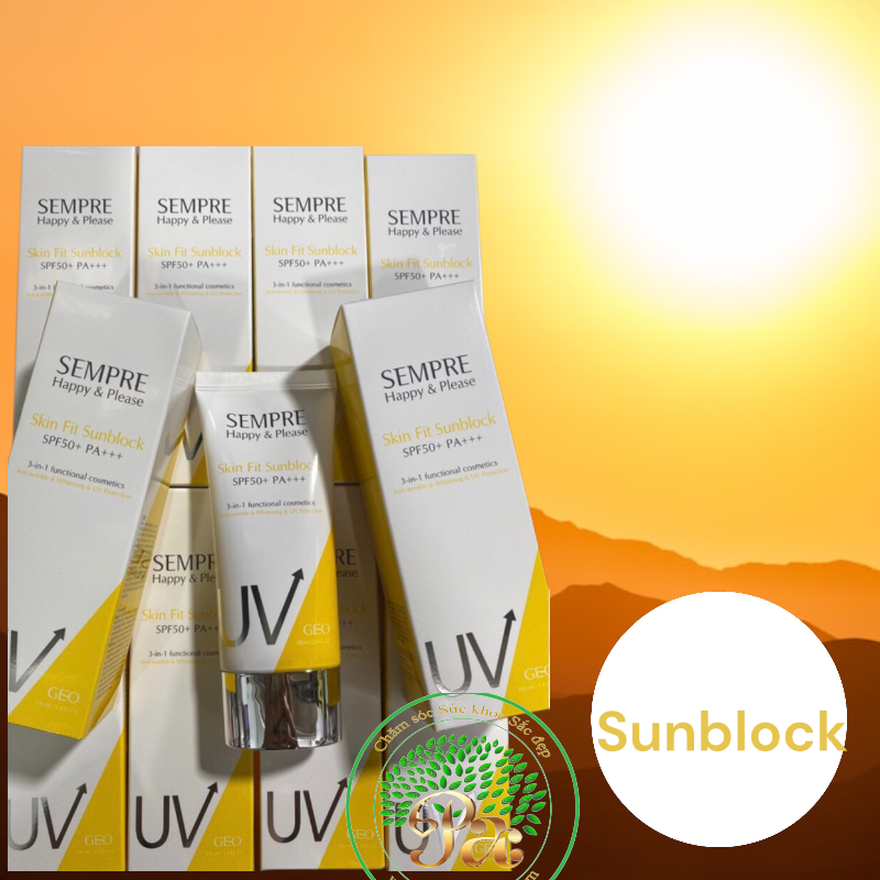 Chống nắng GEO Sempre Happy & Please Skin Fit Sunblock, kem chống nắng đa năng 3 trong 1 đến từ thương hiệu mỹ phẩm Lamy của Hàn Quốc.