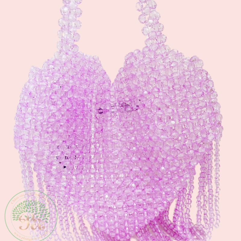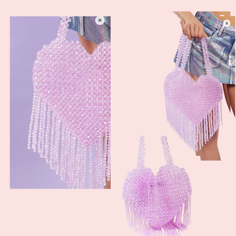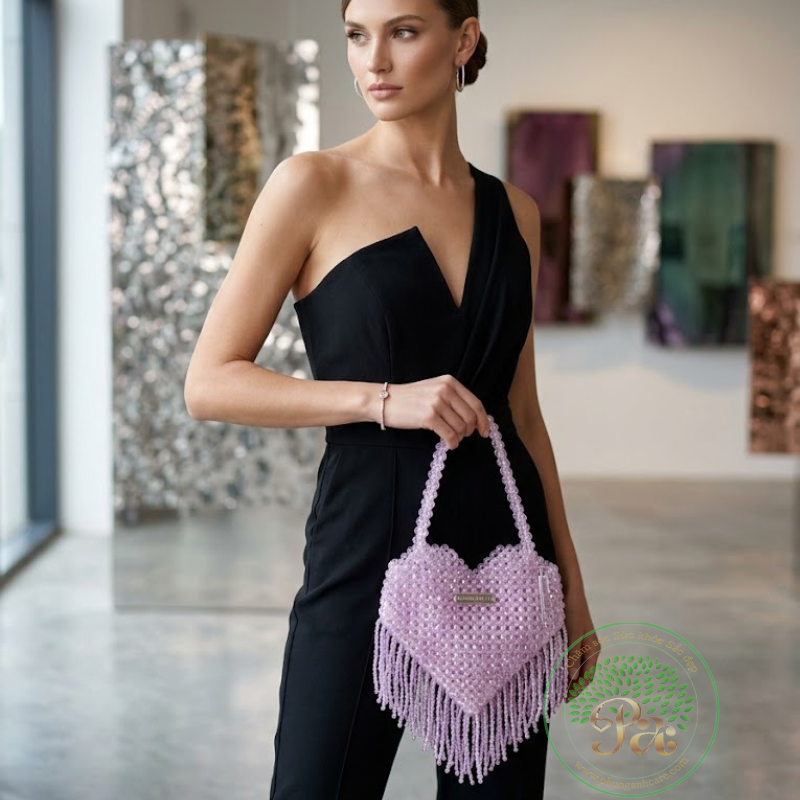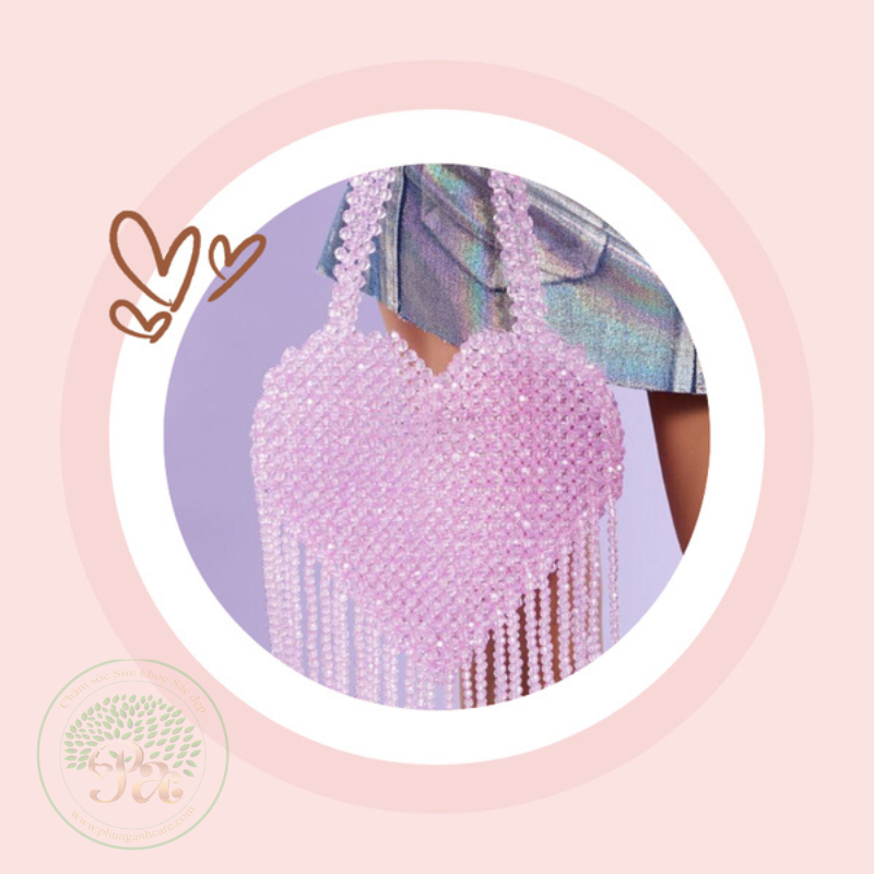 Chiếc túi xách đính hạt hình trái tim màu hồng này có kích thước trung bình, dáng đứng chắc chắn với chi tiết tua rua nổi bật ở phía dưới. Đặc điểm nổi bật Thiết kế: Hình dáng trái tim được làm từ những hạt cườm trong suốt màu hồng với hai quai xách tích hợp ở phía trên.